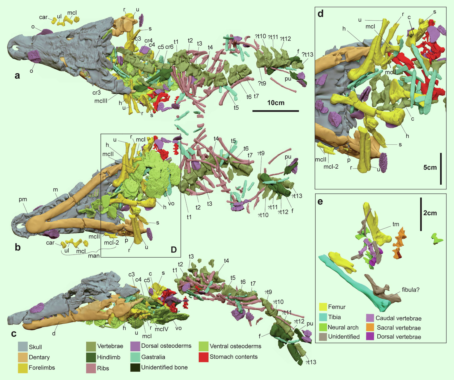 Digital dissection of Confractosuchus sauroktonos in (a) dorsal aspect; (c) ventral aspect; (c) left lateral aspect; (d) close-up of pectoral region with ventral osteoderms removed (in ventral aspect); (e) abdominal contents showing ornithopod remains. Image credit: White et al., doi: 10.1016/j.gr.2022.01.016.