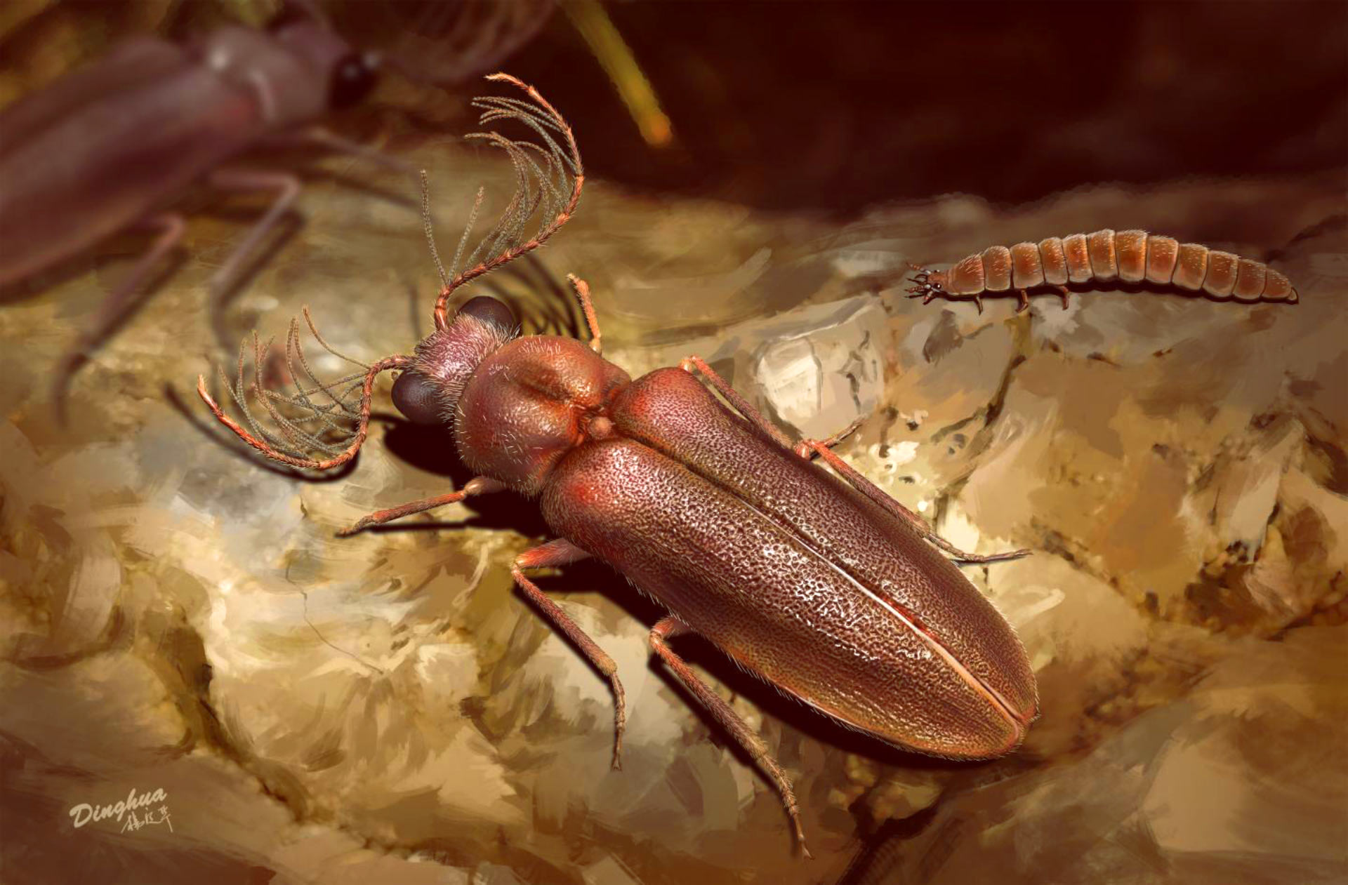 An artistic reconstruction of Cretophengodes azari; the larviform female in the background is reconstructed based on extant Phengodidae and Rhagophthalmidae beetles. Image credit: Li et al., doi: 10.1098/rspb.2020.2730.