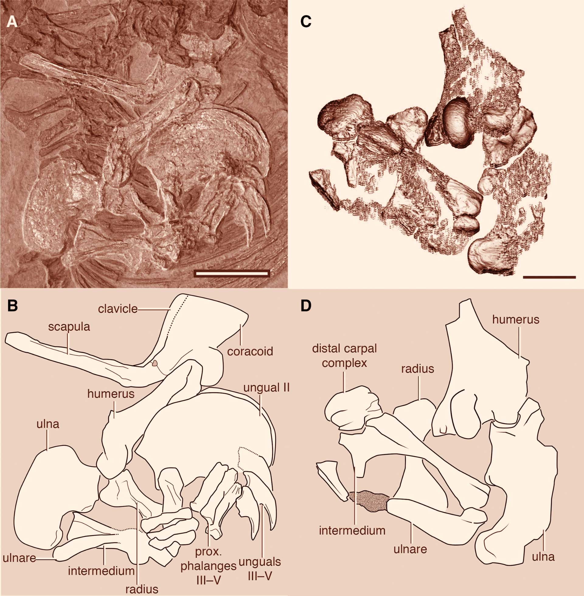 Forelimb specimens of Drepanosaurus unguicaudatus from the Zorzino Limestone (A-B) and Chinle Formation (C-D). Scale bars – 2 cm. Image credit: Adam C. Pritchard et al.