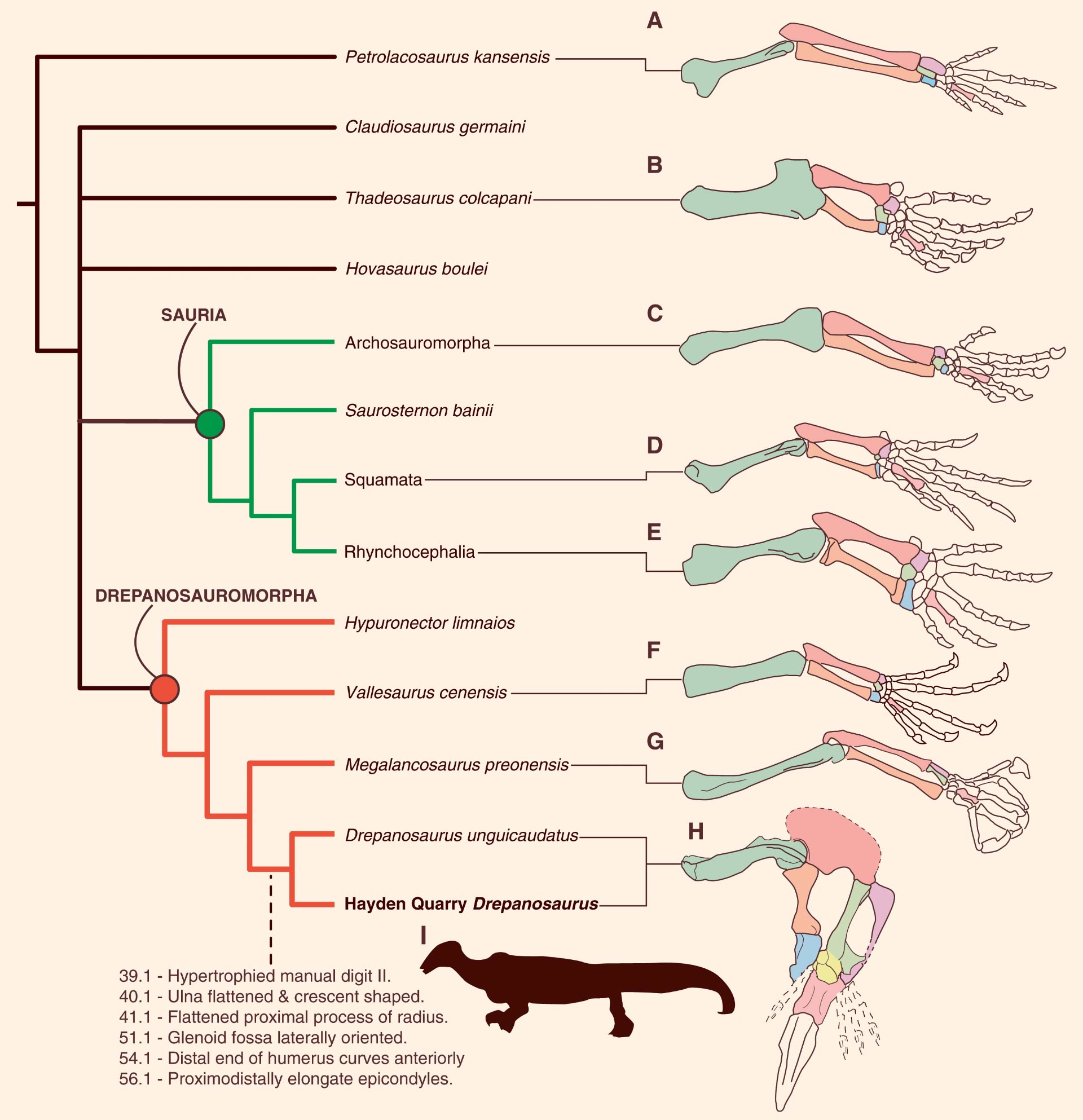 Phylogenetic affinities of Drepanosaurus unguicaudatus and forelimb diversity of Diapsida. Image credit: Adam C. Pritchard et al.