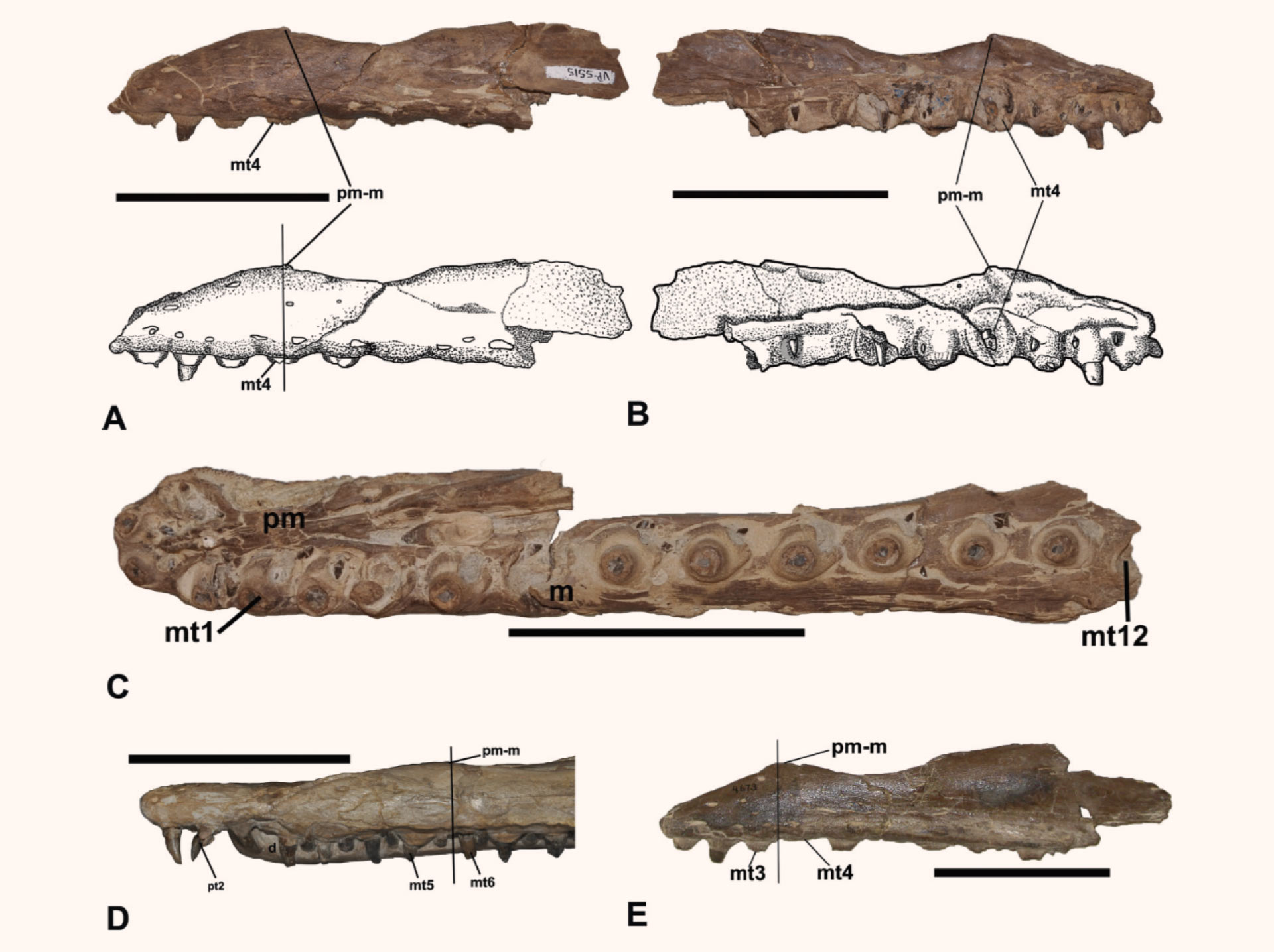 Willman et al. made scientific drawings of Ectenosaurus everhartorum’s jawbone to help understand its taxonomy and to compare it with the jawbone of a similar species, Ectenosaurus clidastoides (labeled D). Image credit: Willman et al., doi: 10.1139/cjes-2020-0175.