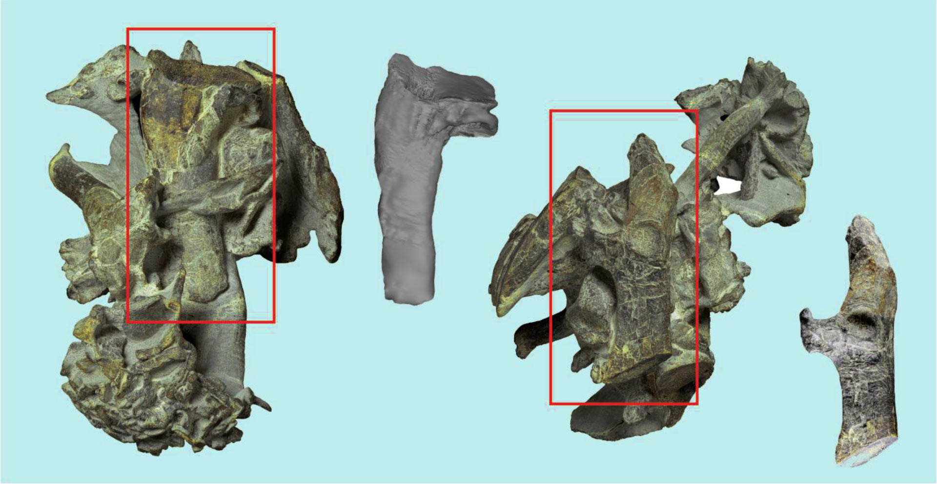 The partly prepared skeleton of Kumimanu biceae. The rectangles emphasize the humerus and a bone from the shoulder girdle (coracoid), which are shown separated from the original bone cluster. Image credit: Senckenberg Research Institute.