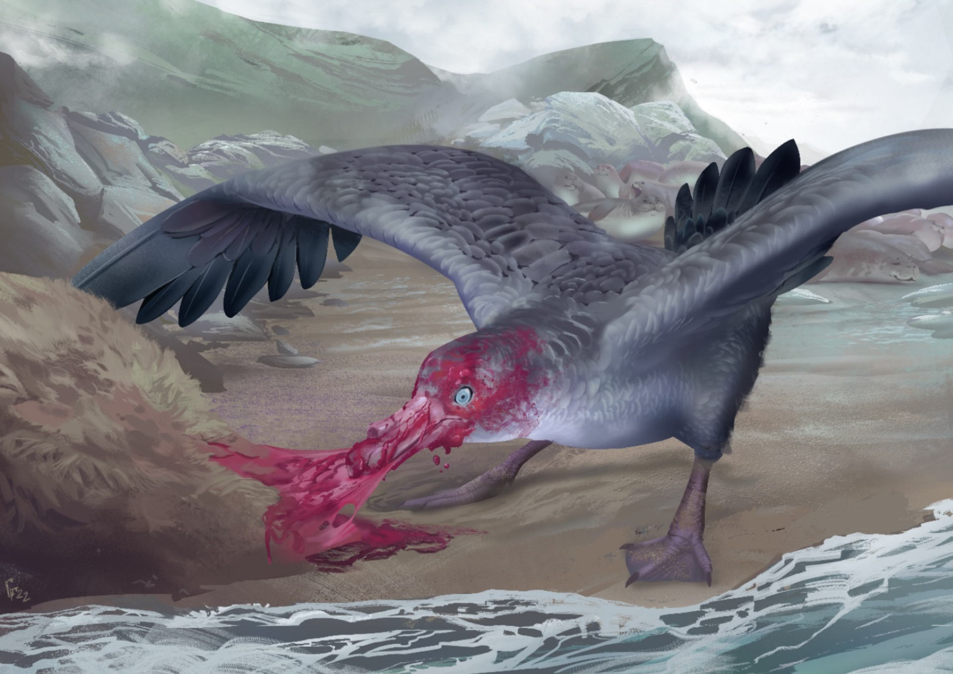 An artistic reconstruction of Macronectes tinae in its paleoenvironment; a darker plumage was chosen for the reconstruction because a darker coloration in giant petrels seems to be related to warmer regions, as Taranaki had warmer temperatures during the Pliocene period. Image credit: Simone Giovanardi / Te Papa.