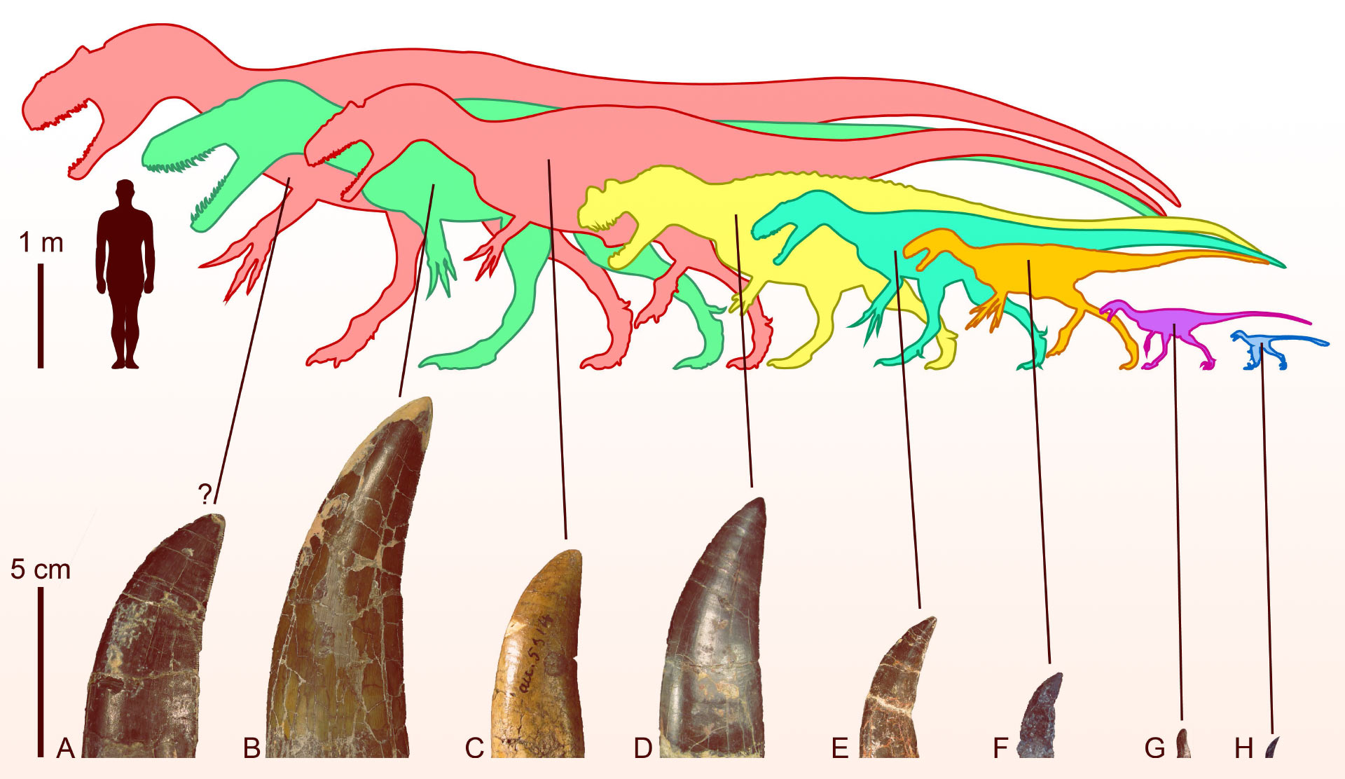 Theropod diversity and largest lateral crowns of theropods from the Morrison Formation of North America: (A) crown of Allosaurus; (B) crown of the megalosaurid Torvosaurus tanneri; (C) crown of the allosaurid Allosaurus sp.; (D) crown of the ceratosaurid Ceratosaurus sp.; (E) crown of the piatnitzkysaurid Marshosaurus bicentessimus; (F) crown of the tyrannosauroid Tanycolagreus topwilsoni; (G) crown of the maniraptoriform Ornitholestes hermanni; (H) crown of the troodontid Hesperornithoides miessleri. Image credit: Lei et al., doi: 10.7717/peerj.16327.