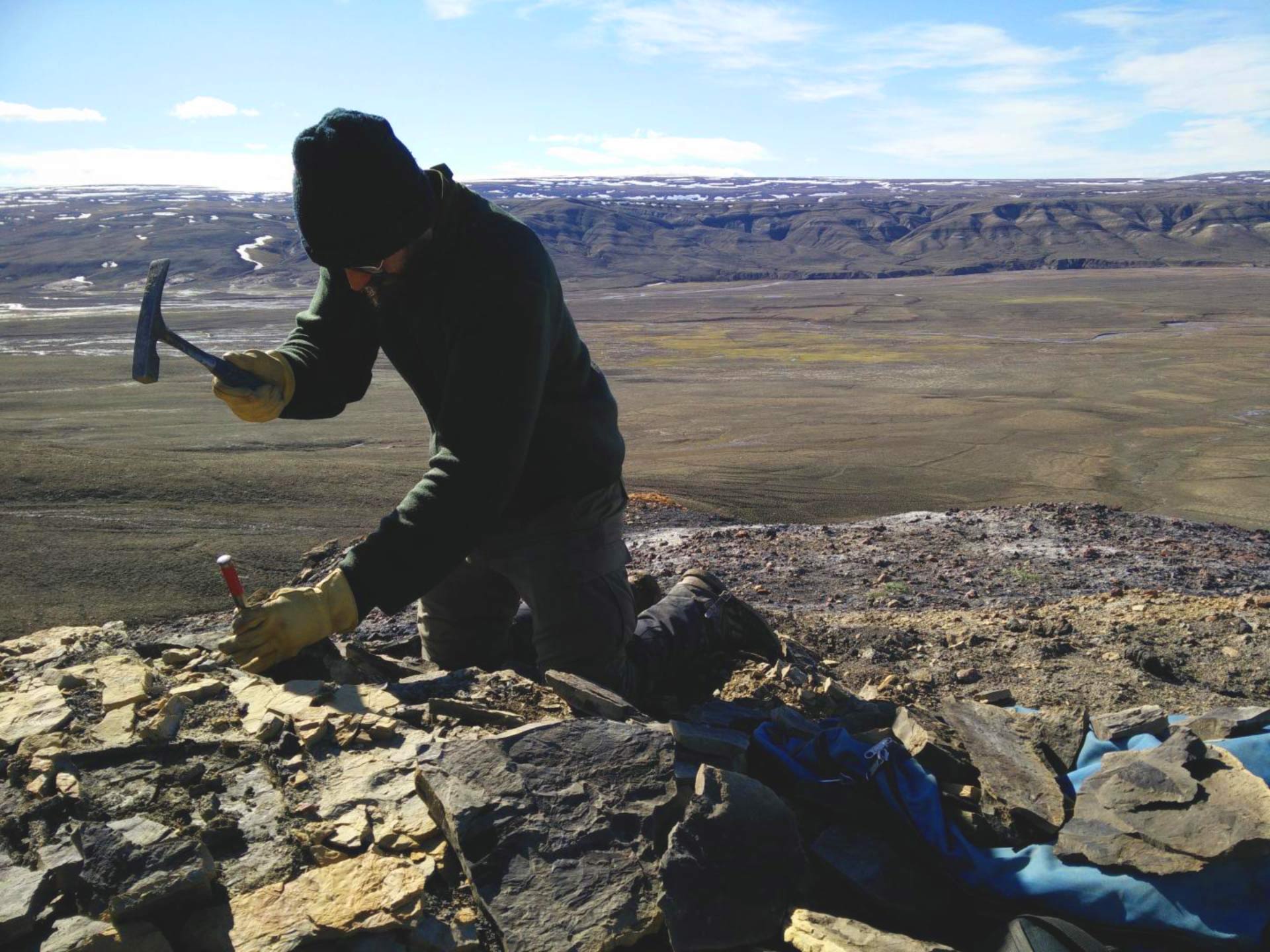 Dr. West hunts for fossils using a rock hammer to split apart shale on Ellesmere Island. Image credit: Markus Sudermann.