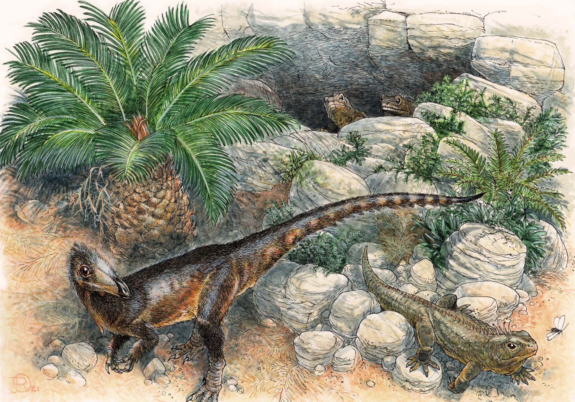 Life reconstruction of Pendraig milnerae among the fissures of Pant-y-ffynnon and three individuals of the rhynchocephalian lepidosaur Clevosaurus cambrica during the Late Triassic epoch. Image credit: James Robbins.