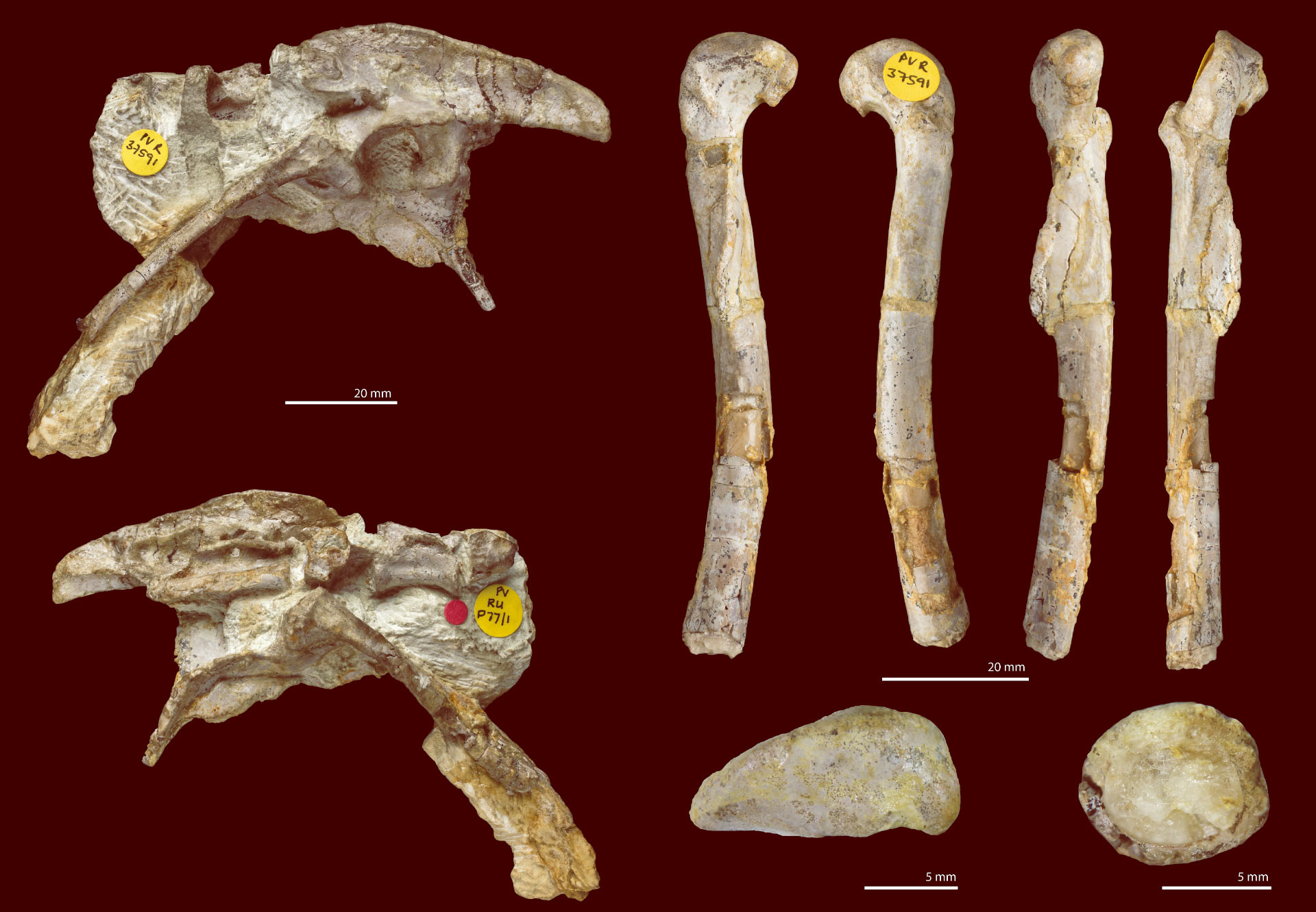 The fragmentary fossils of Pendraig milnerae consist of an articulated pelvic girdle, sacrum and posterior dorsal vertebrae, and an associated left femur, and two referred specimens, comprising an isolated dorsal vertebra and a partial left ischium.