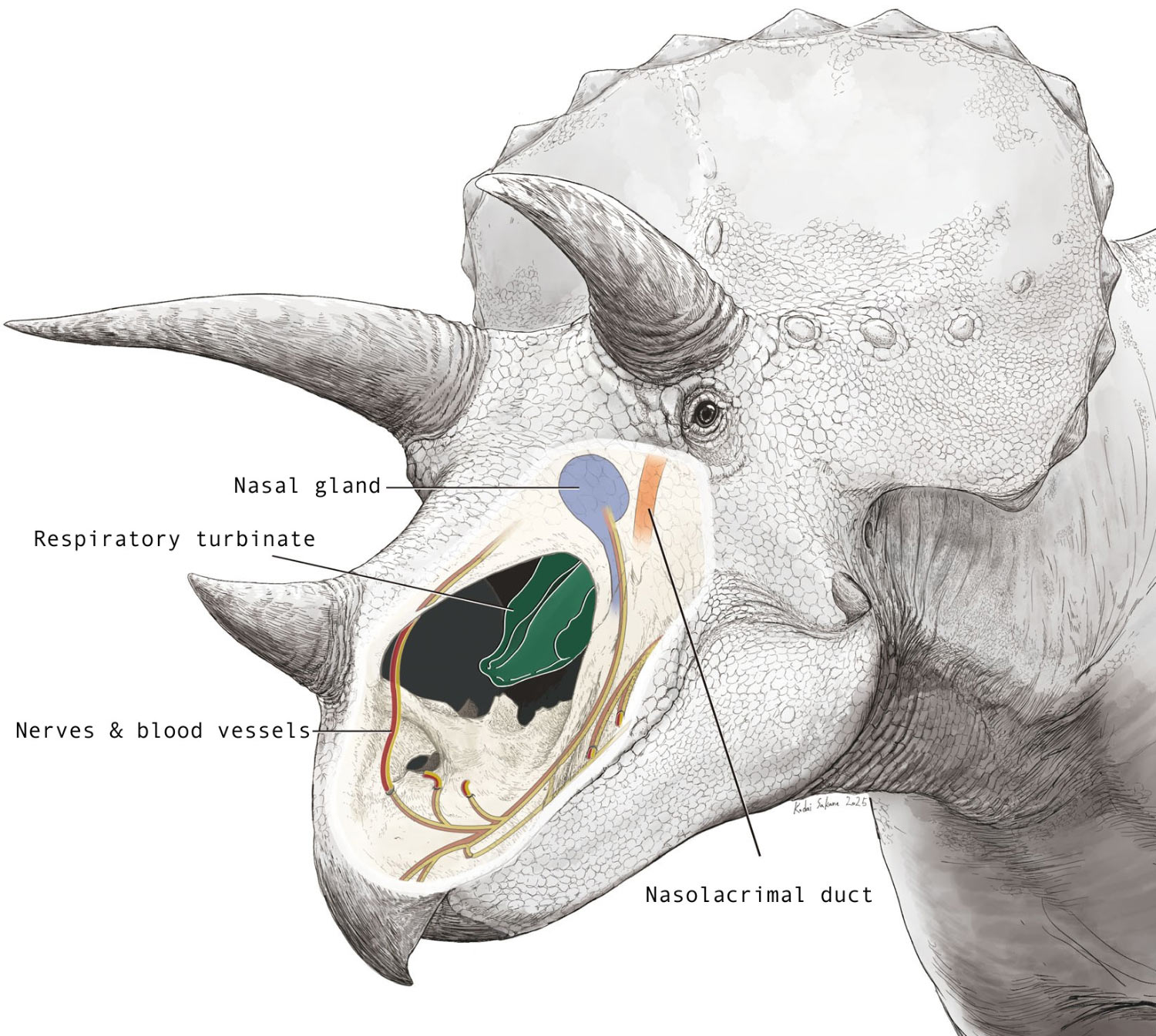 The researchers also identified a specialized structure in Triceratops’ nose known as a respiratory turbinate, an anatomical feature almost unknown among other dinosaurs but common in their living descendants, birds, as well as in mammals.