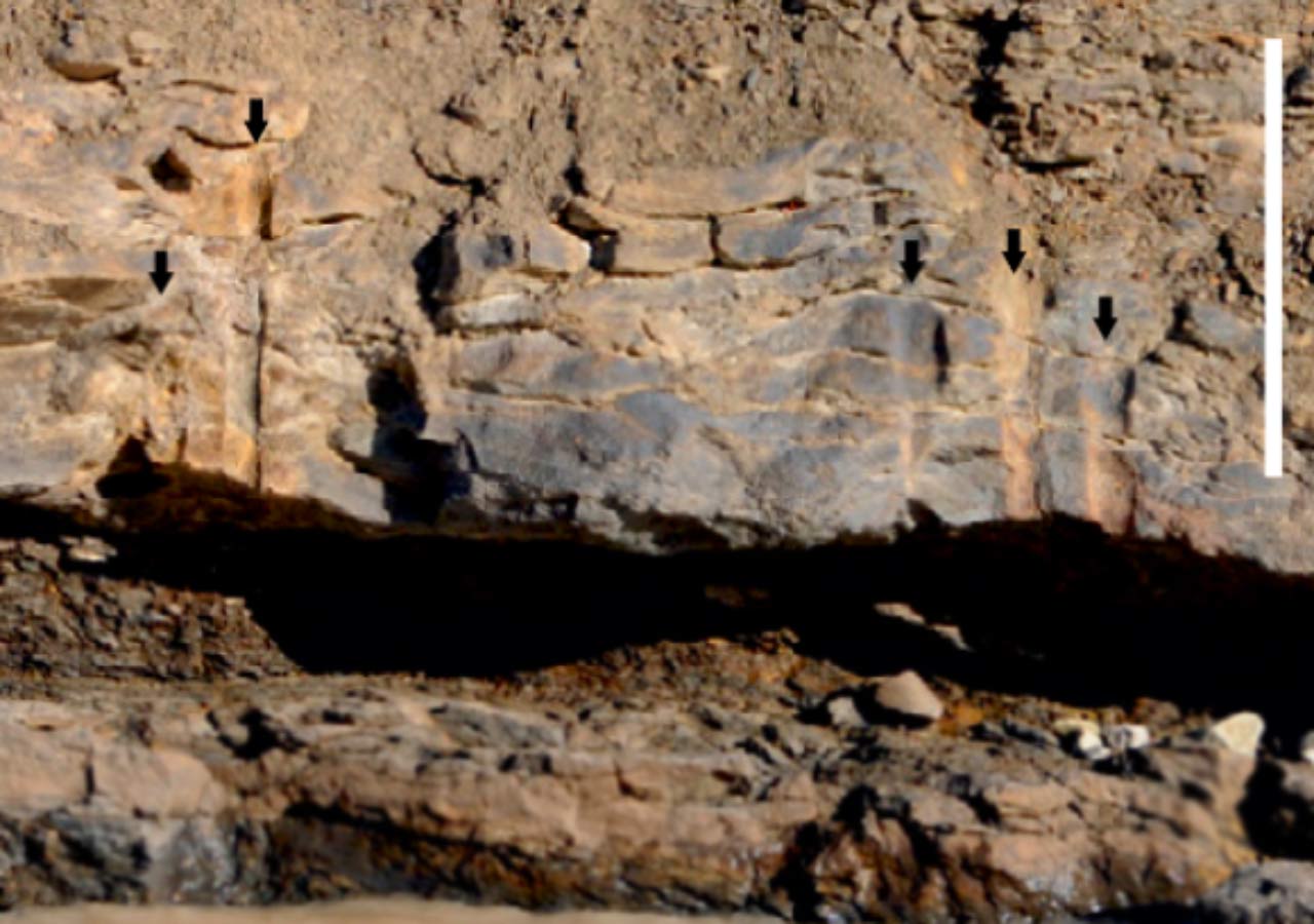 Lycopsid forest: sand-stone with undulating bedding with external casts of at least five upright lycopsid trunks (arrows), with bases in dark gray shaley paleosol with small roots. Scale bars – 50 cm. Image credit: Christopher M. Berry / John E.A. Marshall.