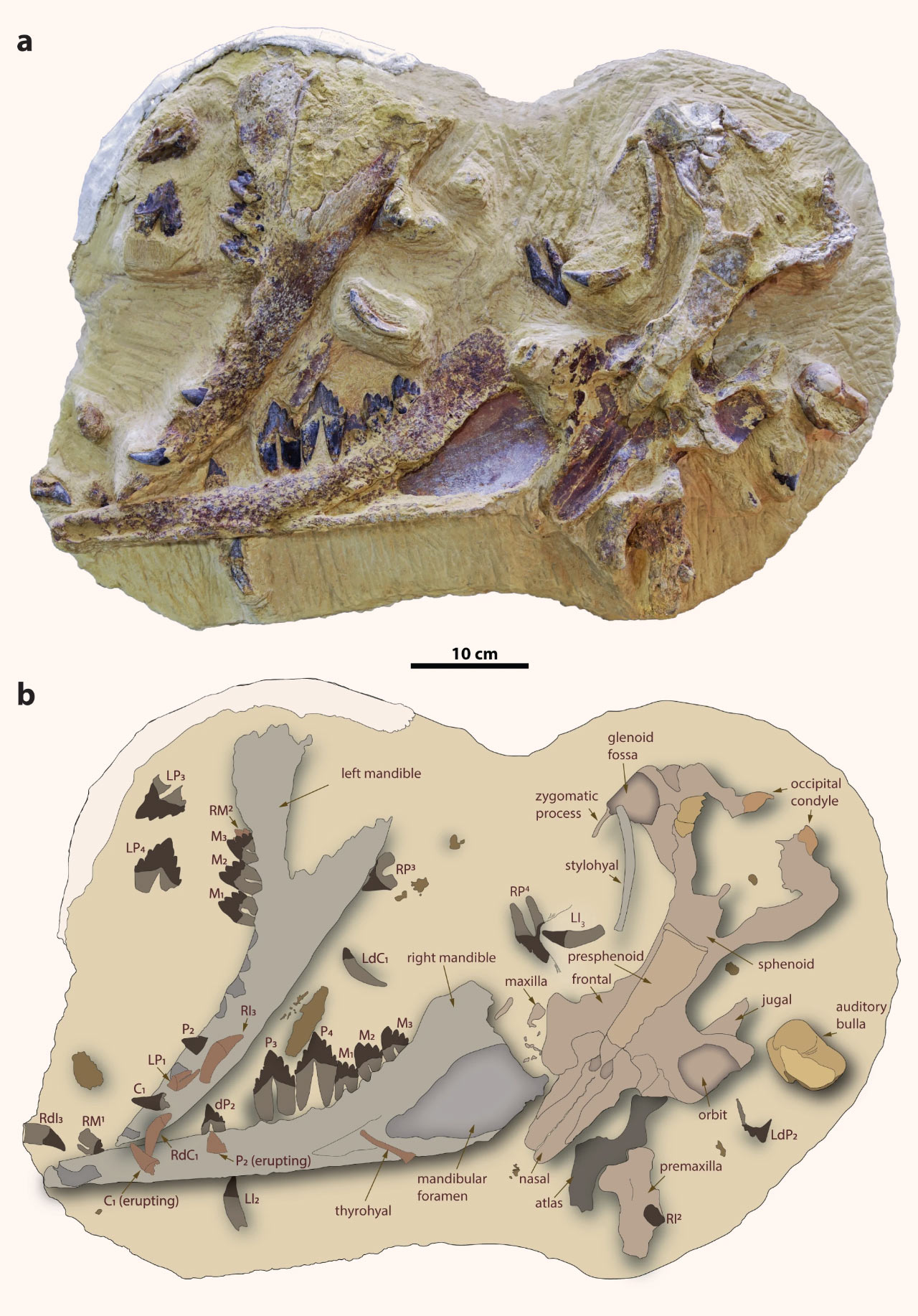 Photograph (a) and corresponding explanatory line drawing (b) of the block containing the holotype specimen of Tutcetus rayanensis. Image credit: Antar et al., doi: 10.1038/s42003-023-04986-w.