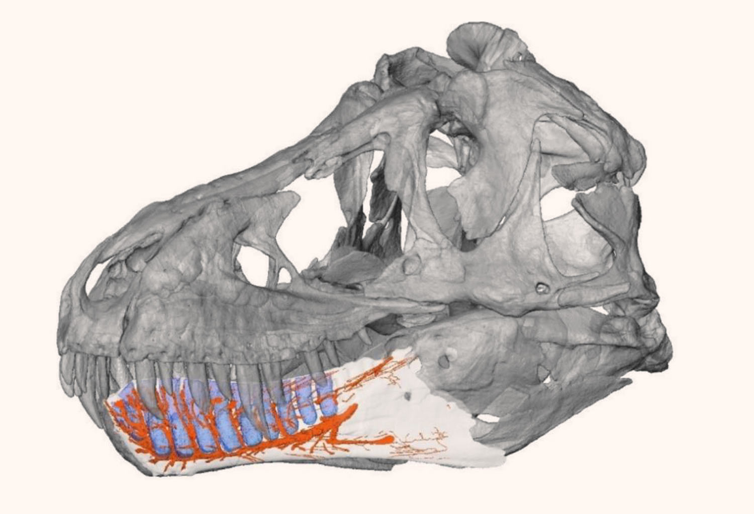 Paleontologists have analyzed the morphology of the neurovascular canal in the well-preserved jaw of Tyrannosaurus rex using computed tomography techniques. Their results show that the dinosaur’s neurovascular canal had a rather complex branching amongst the dinosaurs and that its complexity was comparable to that of living crocodiles and tactile-foraging birds.