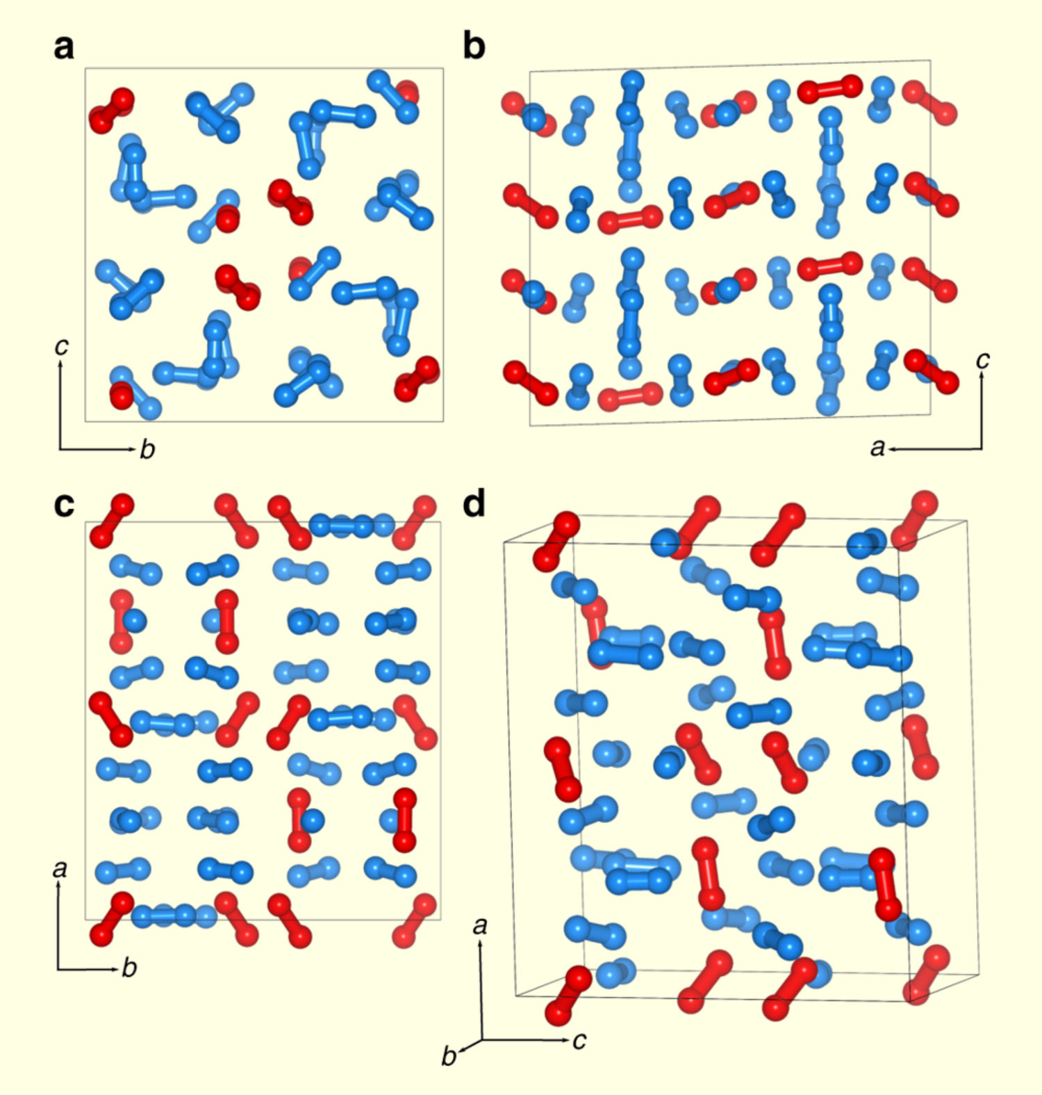 The crystal structure of ι–N2: (a-c) projections along the a, b and c axes respectively; (d) a perspective projection of the unit cell; layered N2 molecules are shown in blue and oriented molecules are shown in red. Image credit: Turnbull et al, doi: 10.1038/s41467-018-07074-4.