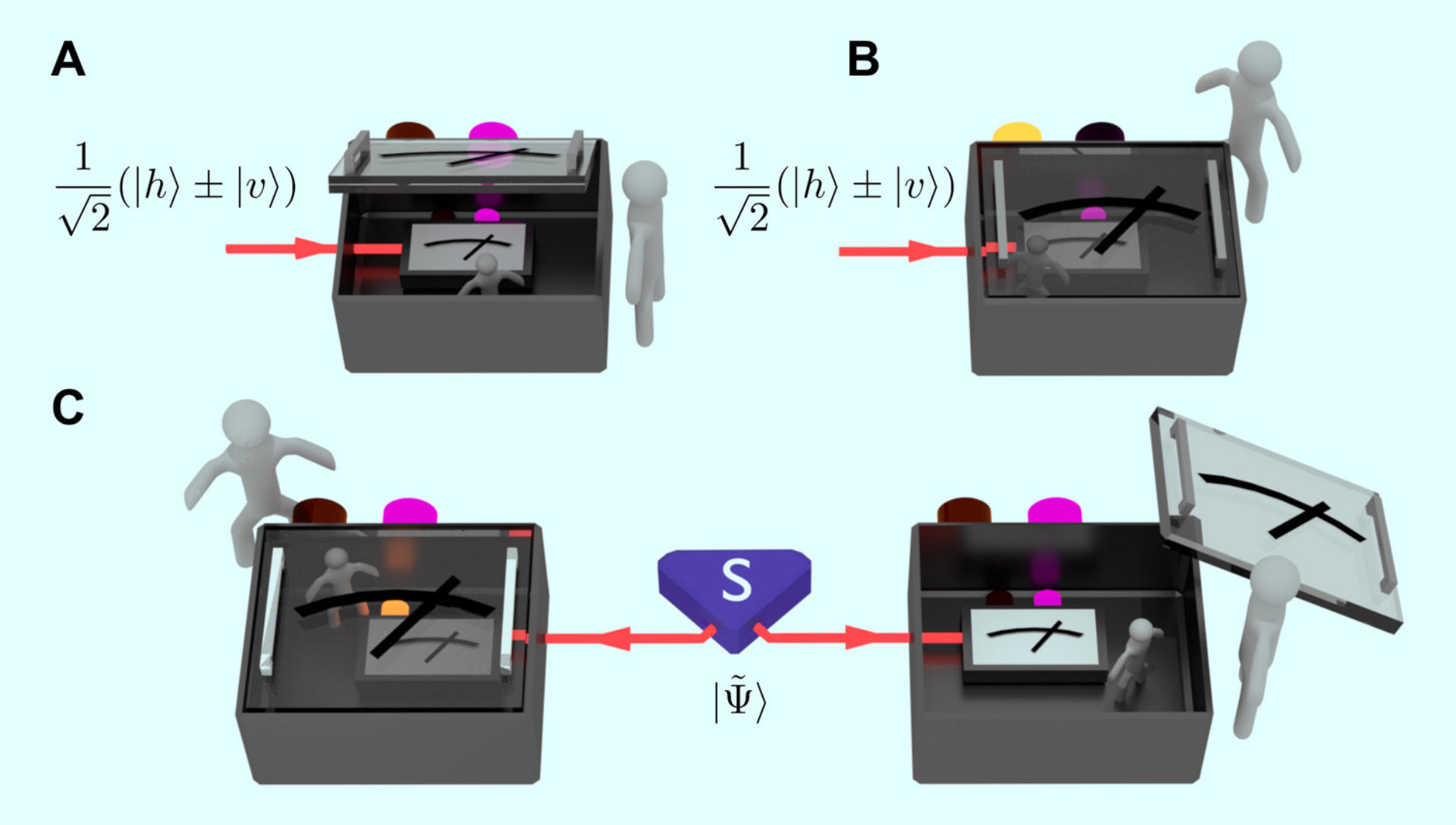 Wigner’s friend experiment: (A) a quantum system in an equal superposition of two possible states is measured by Wigner’s friend (inside the box); according to quantum theory, in each run, she will randomly obtain one of two possible measurement outcomes; this can be verified by directly looking into her laboratory and reading which result she recorded; (B) from outside the closed laboratory, however, Wigner must describe his friend and her quantum system as a joint entangled state; Wigner can also verify this state assignment through an interference experiment, concluding that his friend cannot have seen a definite outcome in the first place; (C) we consider an extended version of that experiment, where an entangled state is sent to two different laboratories, each involving an experimenter and their friend. Image credit: Proietti et al, doi: 10.1126/sciadv.aaw9832.
