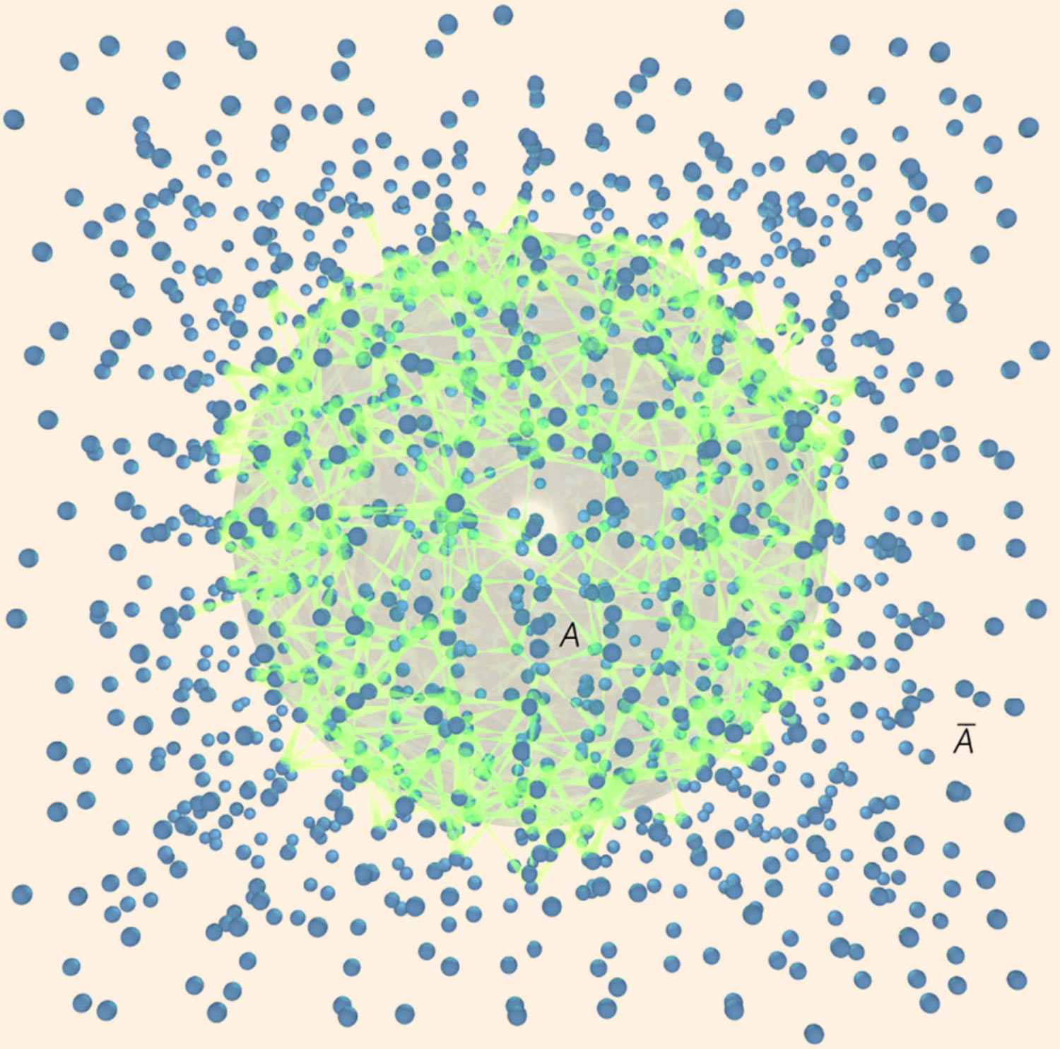 Entanglement across a spherical boundary: a container of superfluid helium-4 is bipartitioned into a sphere of helium atoms A (green) and its complement A– (blue). The entanglement between A and A– is dominated by an area law, scaling with area of the bounding surface. Image credit: C.M. Herdman et al, doi: 10.1038/nphys4075.