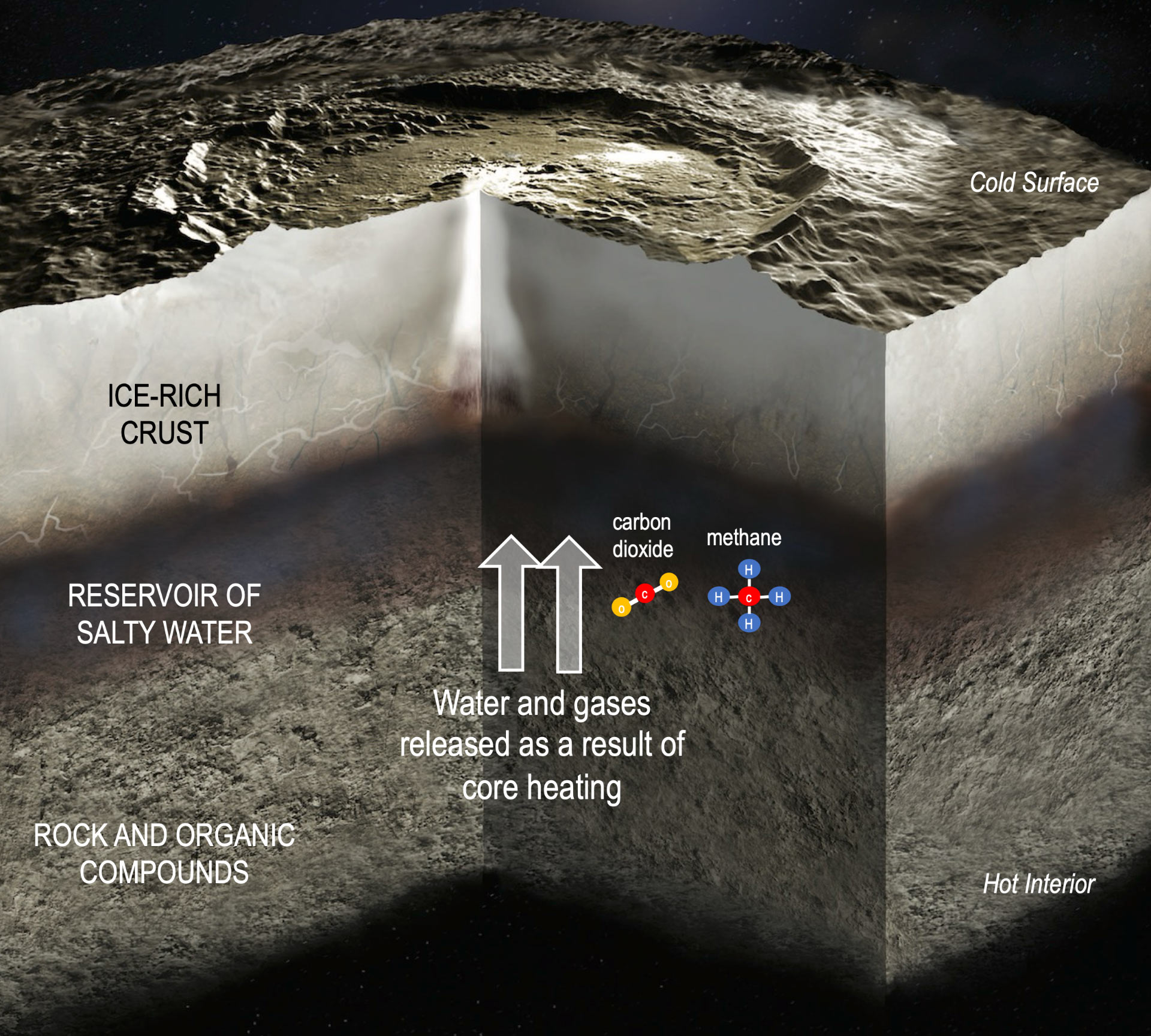 This illustration depicts the interior of Ceres, including the transfer of water and gases from the rocky core to a reservoir of salty water; carbon dioxide and methane are among the molecules carrying chemical energy beneath Ceres’ surface. Image credit: NASA / JPL-Caltech.