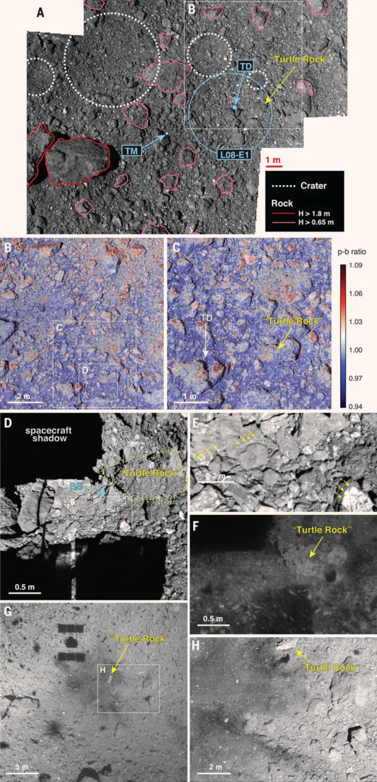 Touchdown site before, during, and after the touchdown operation: (A) boulder and crater map around the touchdown site L08-E1; the light blue arrows indicate the location of the target marker (TM) and the touchdown point of the sampler horn (TD); the light blue circle indicates the L08-E1 area; the white dashed circles indicate craters; boulder heights (H) were estimated from their shadow lengths; those with H > 1.8 m are outlined in red and those with H > 0.65 m are outlined in pink; the boulder nicknamed Turtle Rock is indicated by the yellow arrow; the white box indicates the region shown in later panels; (B and C) p-b ratio images calculated from b- and p-band images obtained during the touchdown rehearsal operation, from two different altitudes; the dashed boxes in (B) indicate regions shown in the other panels; (D) an image obtained during the spacecraft’s descent before the touchdown; the dark, ragged Turtle Rock and an example of bright boulders (BB) with smooth surfaces are outlined in yellow and cyan dashed lines, respectively; the white dashed box indicates the area shown in (E); (E) close-up of the image in (D), with yellow arrows indicating fresh bright spots at corners and a possible broken plane of a boulder; (F and G) images obtained 7 and 47 s after the touchdown, showing debris lifted from the surface; (H) ul-band image obtained at 76-m altitude after the touchdown; Turtle Rock was lifted clear of the surface by the exhaust from Hayabusa2’s RCS thrusters, indicated by the yellow arrows in (F) to (H). Image credit: Morota et al, doi: 10.1126/science.aaz6306.