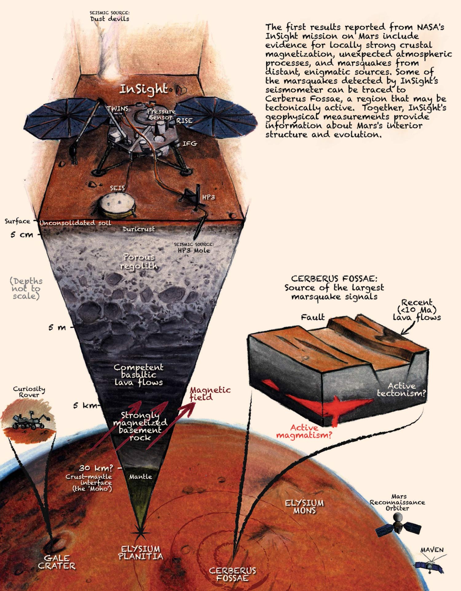 Billions of years ago, Mars had a magnetic field. It is no longer present, but it left ghosts behind, magnetizing ancient rocks that are now between 61 m (200 feet) to several km below ground. InSight is equipped with a magnetometer — the first on the surface of Mars to detect magnetic signals.