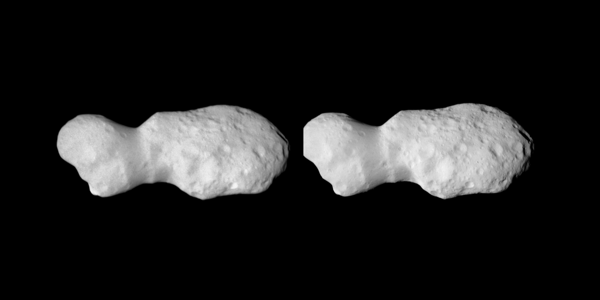 A stereo image pair combining the last complete approach image (right) with a slightly clipped image taken 72 seconds later (left). For a three-dimensional view of the asteroid’s structure, cross your eyes while focusing on the image. Image credit: NASA / Goddard / SwRI / Johns Hopkins APL / Brian May / Claudia Manzoni.