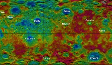 Researchers at NASA have just released colorful new topographic maps of the dwarf planet Ceres, based on data gathered by the agency’s Dawn spacecraft. This map shows the highs and lows of topography on the surface of Ceres. It is labeled with names of features approved by the International Astronomical Union. The color scale extends about 5 miles (7.5 km) below the surface in indigo to 5 miles (7.5 km) above the surface in white. Image credit:...