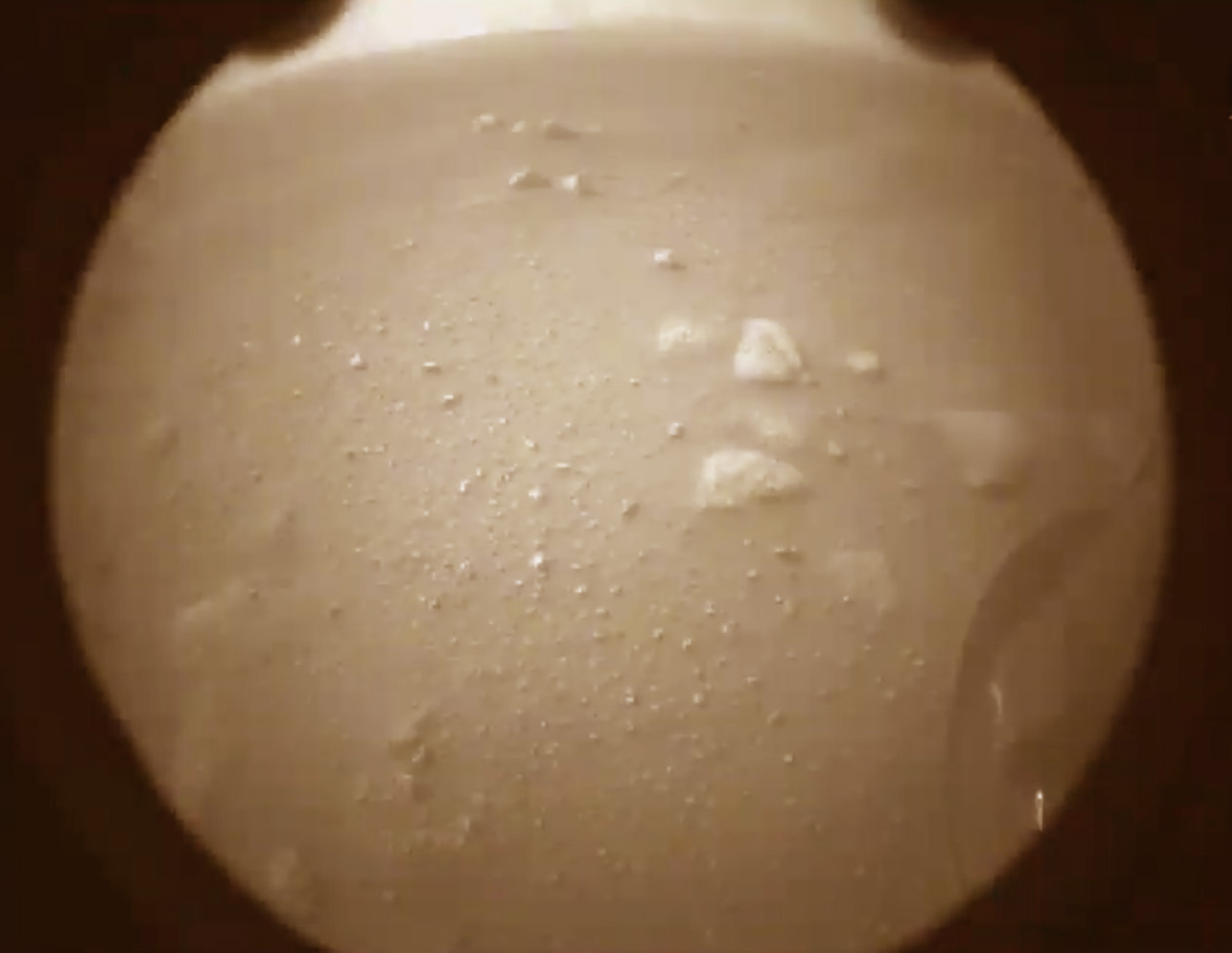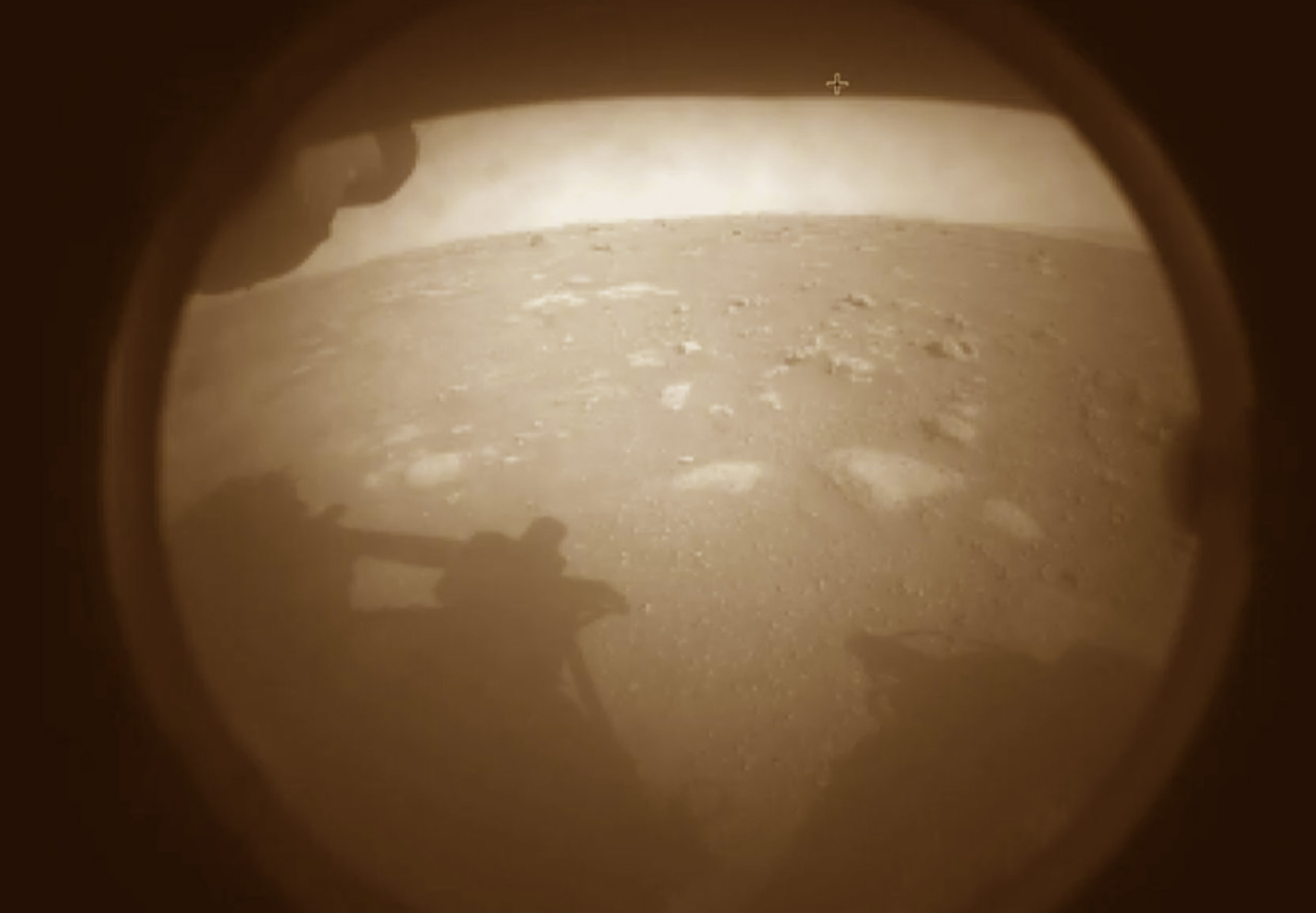 Perseverance’s first image (colorized) from Jezero Crater, Mars. Image credit: NASA’s Jet Propulsion Laboratory.