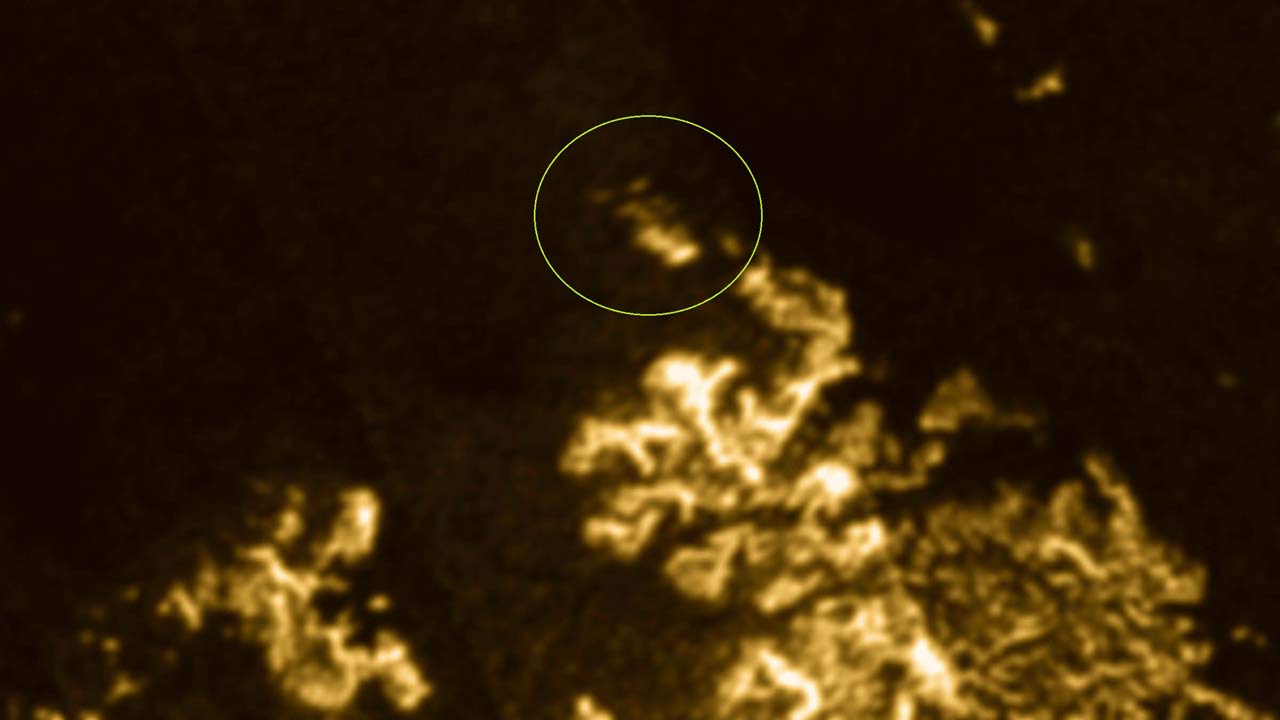 This image shows a bright geologic object, named the Magic Island (green circle) in Ligeia Mare, Titan. Image credit: J.D. Hofgartner et al.