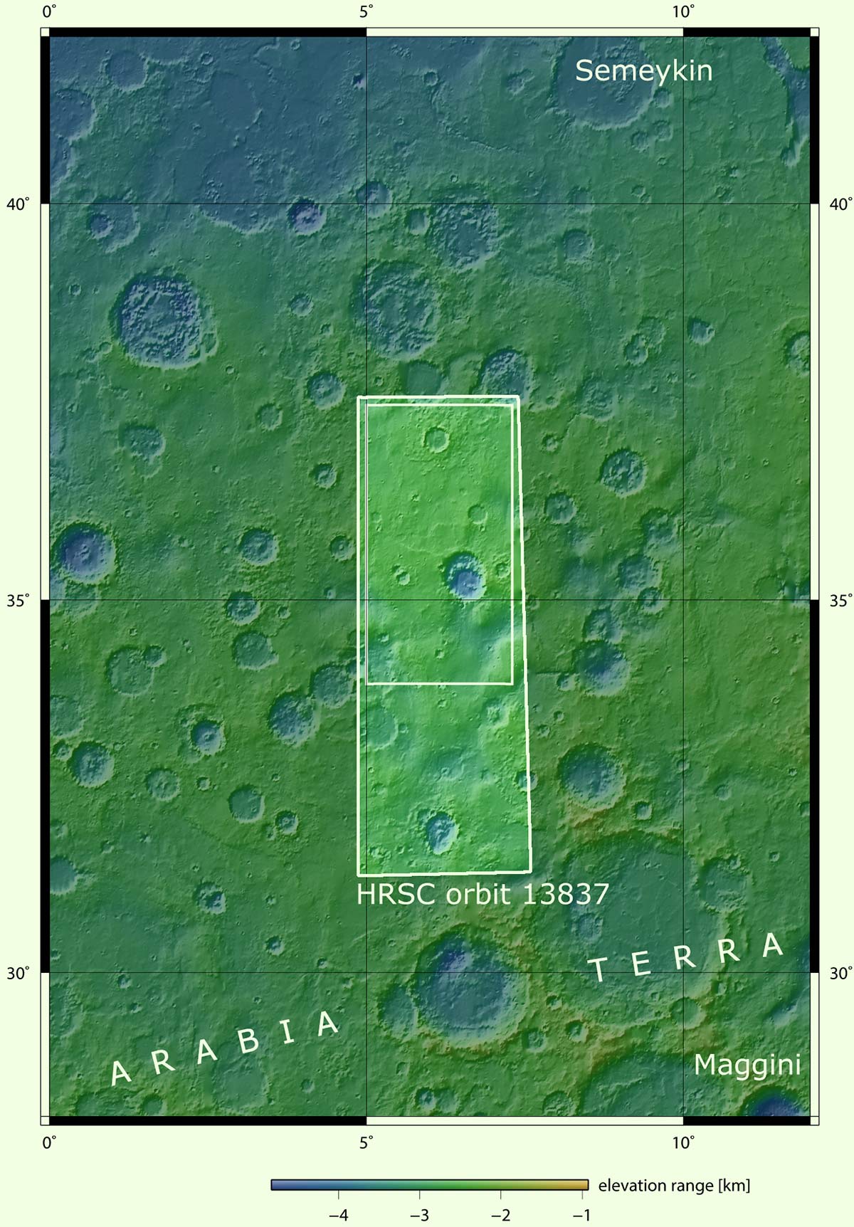 This context image shows the portion of the Arabia Terra region on Mars that was imaged by the High Resolution Stereo Camera on ESA’s Mars Express on 26 November 2014. Siloe Patera is the largest feature in the region outlined by the inner white box. Image credit: NASA / MGS / MOLA Science Team.